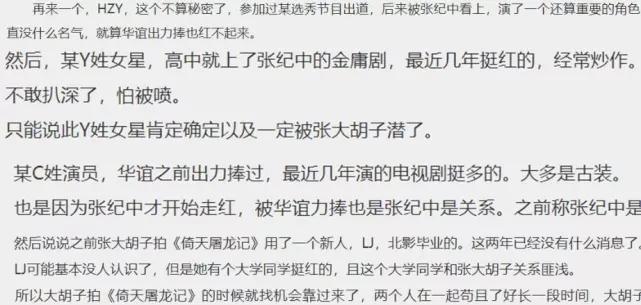 文章中表示,张纪中有一份圈内女星的交易名单,他曾经利用导演的身份潜规则过多位女星。