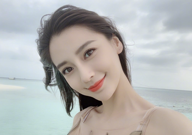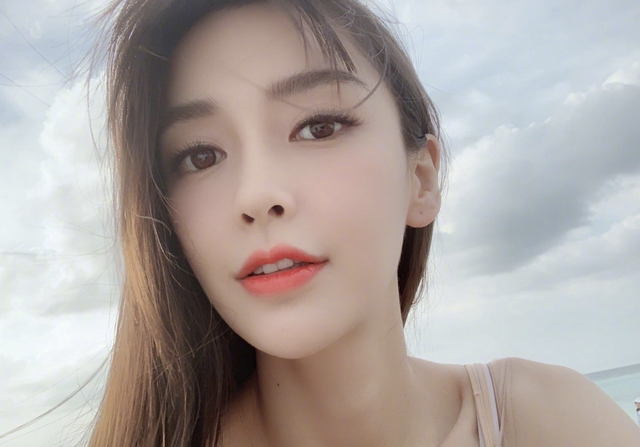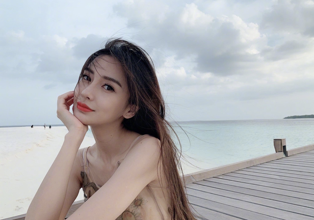 照片中,baby的长发在海风的吹动中飞扬,衣着清凉锁骨亮眼,一抹红唇是点睛之笔。