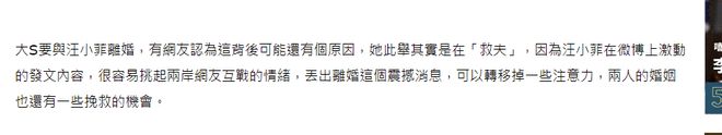 但是有台湾网友质疑表示大S要与汪小菲离婚,背后可能其实是在「救夫」,因为汪小菲在微博上激动的发文内容,很容易挑起两岸网友互战的情绪,丢出离婚这个震撼消息,可以转移掉一些注意力,两人的婚姻也还有一些挽救的机会。