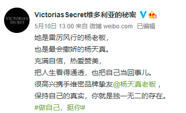 前不久,维密在微博上,官宣杨天真(张雨绮的前经纪人)为品牌挚友,收获一波赞。