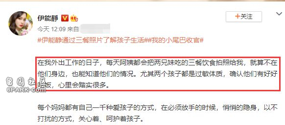 今日节目播出后,伊能静在社交平台上发长文称,自己会通过照顾哈利的阿姨传递的三餐照片来了解孩子的生活,并且确认他们有好好吃饭,才会安心许多。