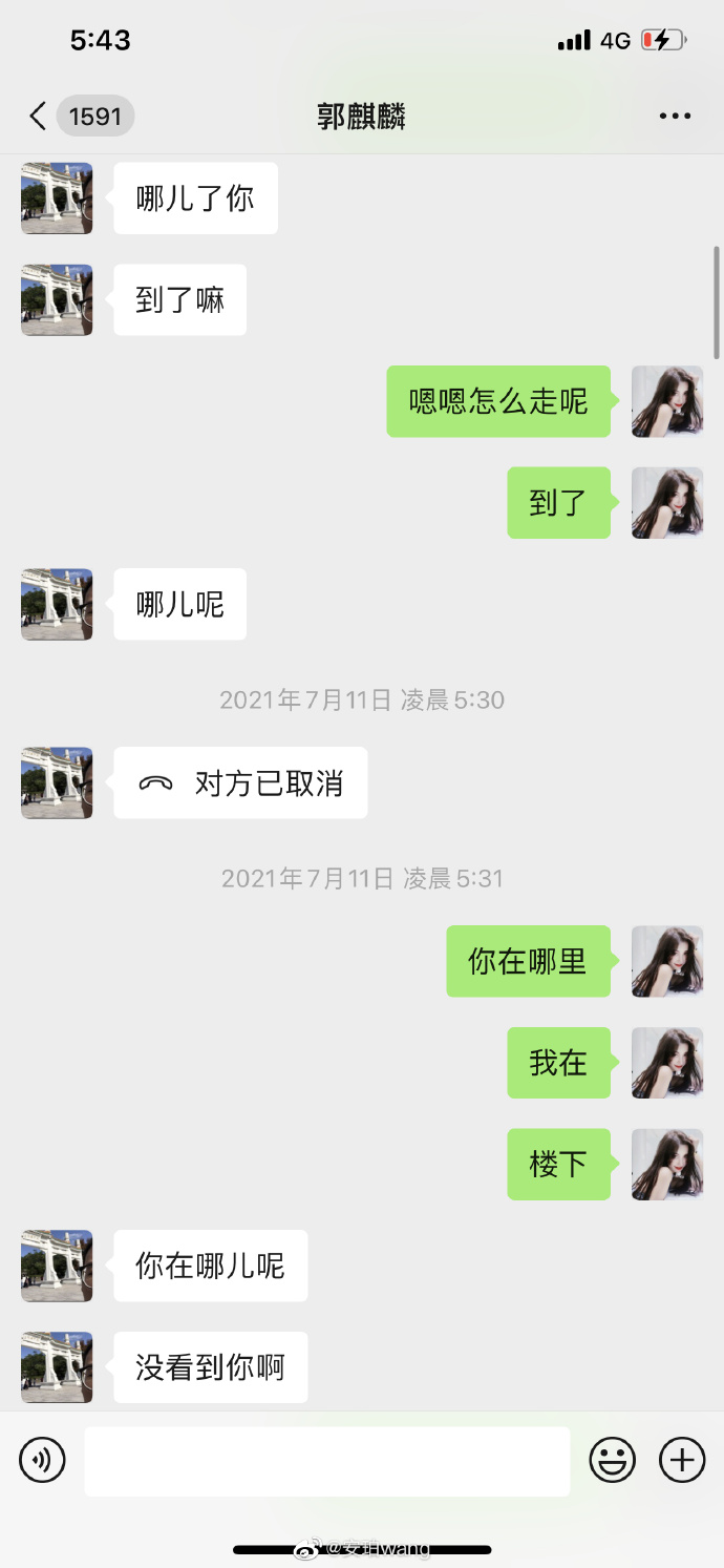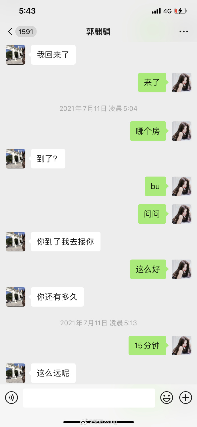 月18日,有一位名为“安珀wang”的女网红在社交平台上发文指控郭麒麟:“我说互删这位大哥不知道多开心,C完我不用敷衍我了哈哈哈”,并曝光了两人的聊天记录。
