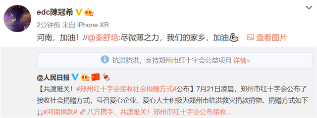 七月二十二日,秦舒培和陈冠希以女儿的名义向河南红十字会捐款五十万元。在转账备注的单子上写着的是“Alaia为家乡抗洪救灾捐款。”夫妻俩选择以年幼的女儿的身份捐款,也是为了从小就培养女儿的爱心吧,更何况,河南其实也是秦舒培的家乡。