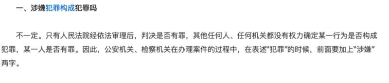 事实上,我国法律规定,一直到法庭正式宣判判处有罪之前,再板上钉钉的罪犯都只是“犯罪嫌疑人”,也都只是“涉嫌犯罪”。
