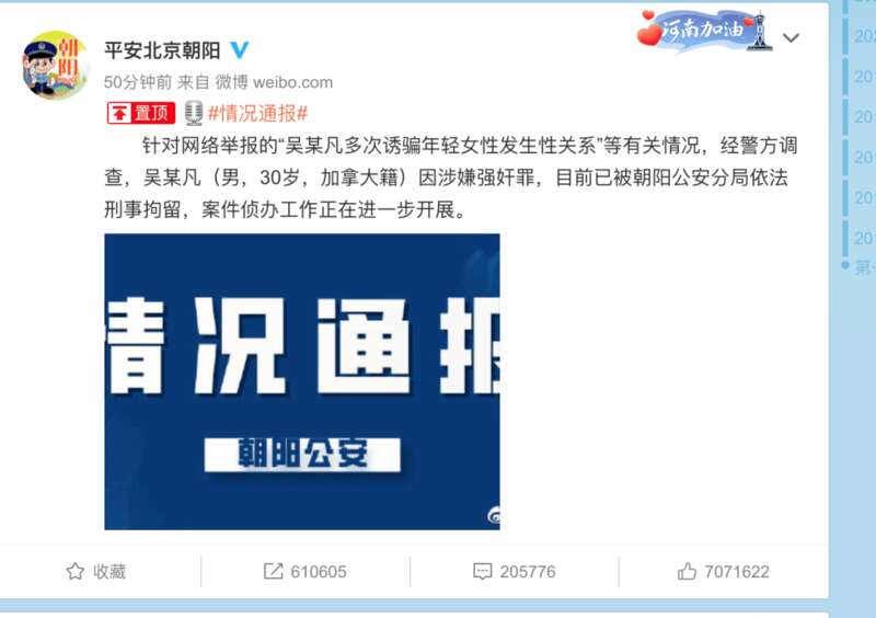 果然,时隔一周,朝阳警方于这个周六的晚上,正式发布通告,以涉嫌强奸将吴亦凡正式拘留:
