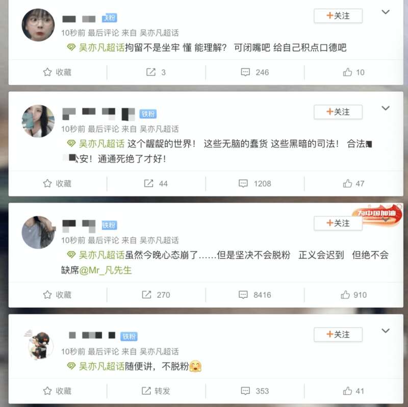 写到这,我发现吴亦凡超话已经没了,但在消失之前的帖子,一群粉丝还在表示“就算是真的我们也不脱粉”、“我们永远不会脱粉了”。