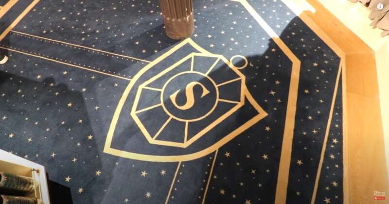 蓝色浩瀚星空的地毯上,印制着格兰芬多、赫奇帕奇、拉文克劳以及斯莱特林四大学院的勋章logo。