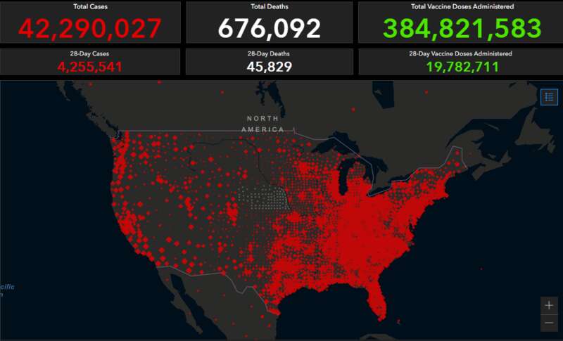 根据美国约翰斯·霍普金斯大学统计数据,截至北京时间2021年9月21日18时40分,美国新冠肺炎累计确诊病例达42290027例,累计死亡病例676092例。在过去一天里,美国新增确诊病例201648例,新增死亡病例2302例。