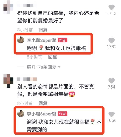 网易娱乐5月12日报道 5月10日,李小璐新恋情疑似曝光引发讨论。11日,李小璐被在社交平台否认恋情,回复网友称现在没有男朋友。随后也有网友为其加油打气称:“祝你找到自己的幸福,我内心还是希望你们能复婚最好了”、“不管真假,都是希望璐姐幸福”,对此李小璐也大方回应表示:“谢谢,我和女儿现在很幸福,不需要别的。”
