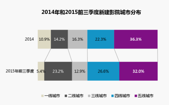 (2015年前三季度,有72%的新建影院布局在三线及其以下城市 | 图源:艺恩数据)