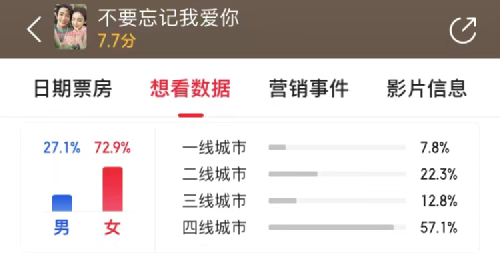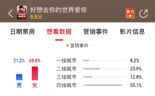 《好想去你的世界爱你》(豆瓣评分4.5),三四线城市观众的占比为67.9%,而在一线城市,只有8.2%;