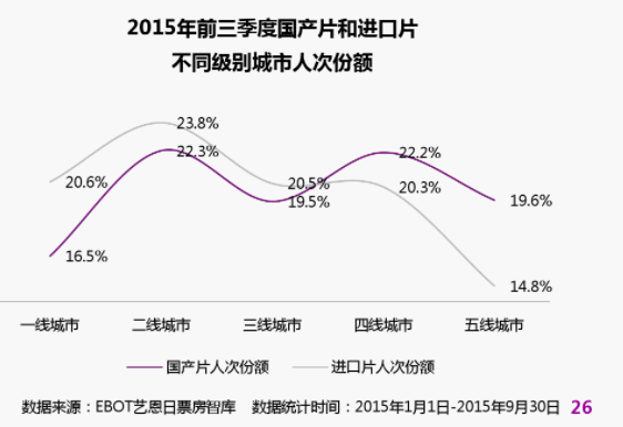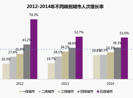 到了2014年,三线及以下城市票房已经超过了北、上 、 广 、深等一线城市的总和。