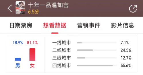 《十年一品温如言》(豆瓣评分2.7),三四线城市的观众占比为68.3%,而一线城市占比仅为7.1%;
