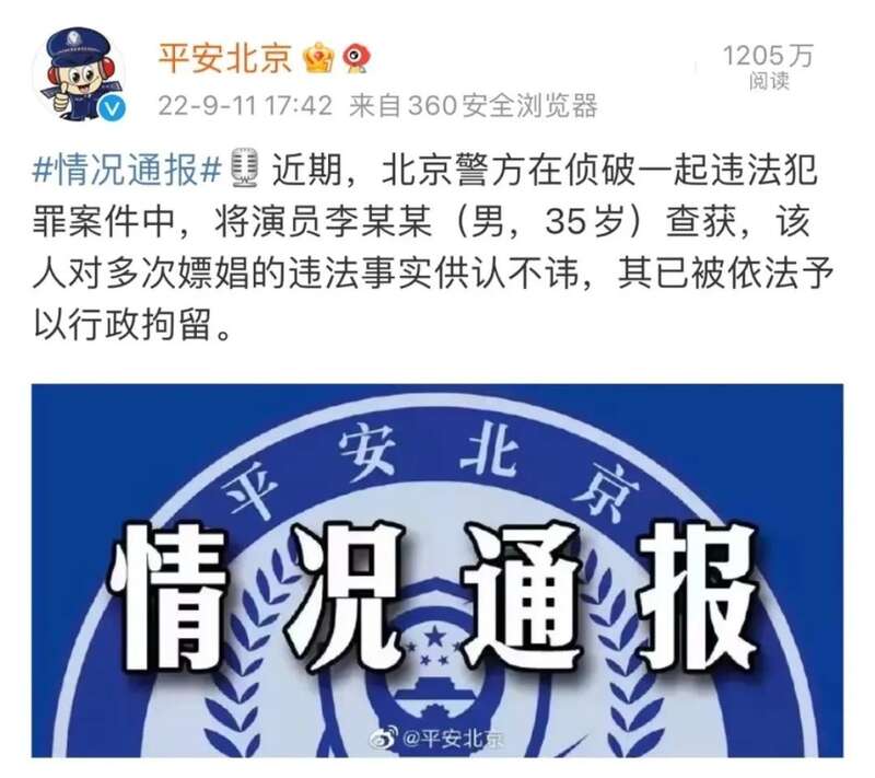 11日下午,@平安北京官方微博发布通报称,近期,北京警方在侦破一起违法犯罪案件中,将演员李某某(男,35岁)查获,该人对多次嫖娼的违法事实供认不讳,其已被依法予以行政拘留。