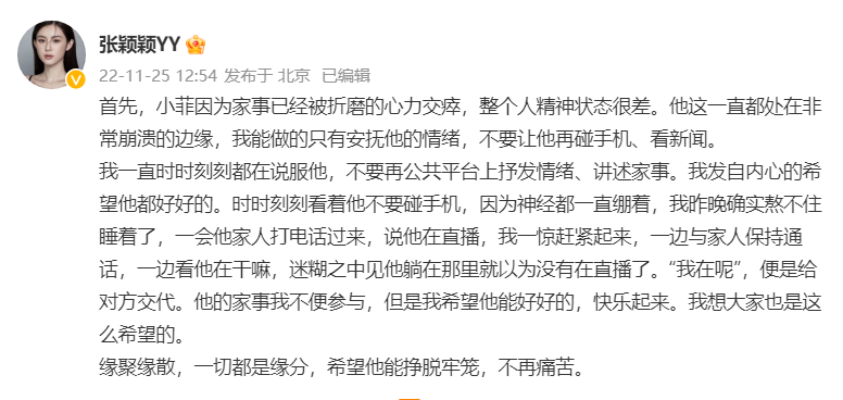 张颖颖在文中先是说到,汪小菲被家事折磨得心力交瘁,整个人精神状态很不好,一直处在非常崩溃的边缘,她一直在安抚他的情绪。