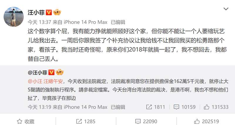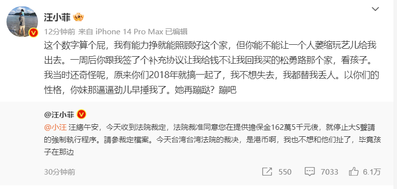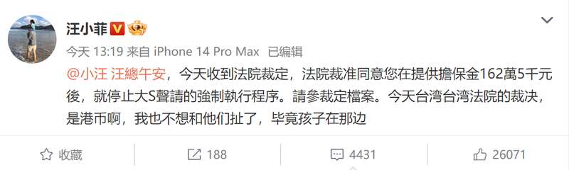 11月25日,汪小菲转发贴出了委托律师的消息:“收到法院裁定,法院裁准同意您在提供担保金162万5千元后,就停止大S申请的强制执行程序。请参裁定档案。”随后汪小菲自己说:“今天台湾法院的裁决,是港币啊,我也不想和他们扯了,毕竟孩子在那。”言下之意就是妥协不想折腾了。