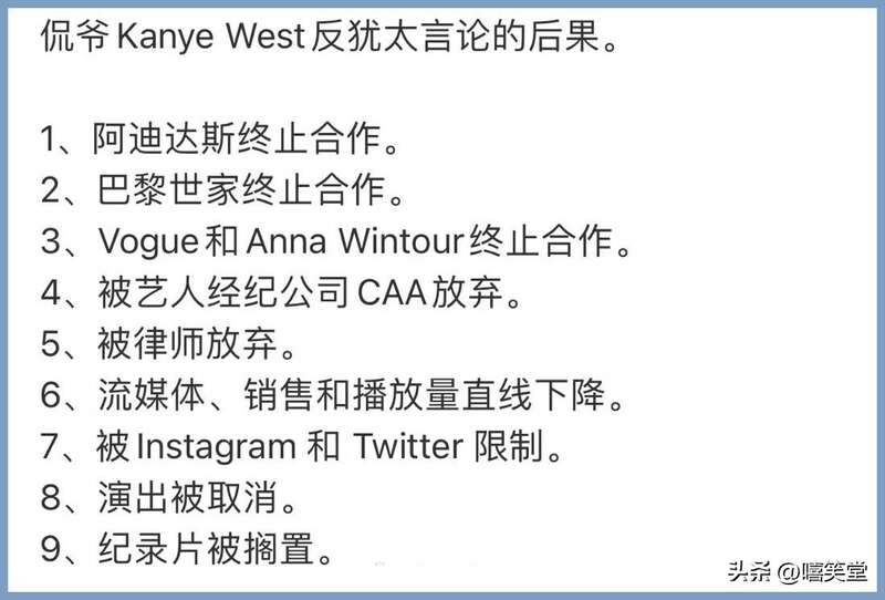侃爷因为对犹太人的言论,已经遭遇了非常严重的后果。