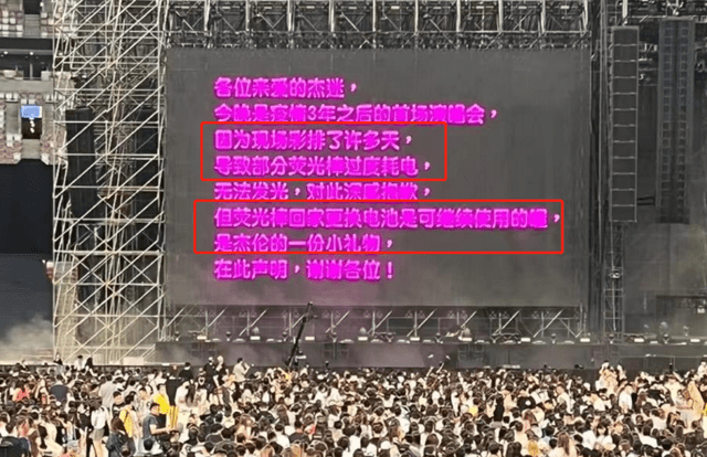 主办方解释说是因为彩排太多次,才导致荧光棒没有电。还强调这是杰伦送粉丝的礼物,大家拿回家换个电池就可以用了。该网友顿时就迷惑了,哪场演唱会没有荧光棒,“这也能说成是礼物?”