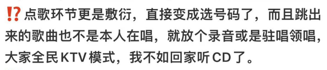 到了和粉丝互动的点歌环节,居然直接选号码。这可能是想换一个新模式,粉丝也接受了,但是跳出来的歌曲居然不是周杰伦本人在唱。不是放录音就是驻唱领唱,从幸运观众福利变成全民KTV。粉丝直接吐槽不如回家听CD。