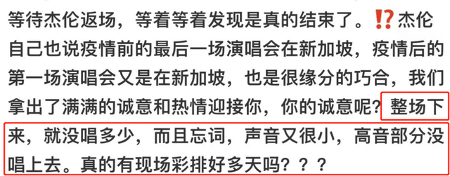 还有网友表示2015年的时候就感受到他的敷衍了,也是迟到而且唱的歌也不多。周杰伦近几年的状态确实有下滑,嗓子完全不一样了,连专辑录音棚的声音都很不稳,更何况现场。
