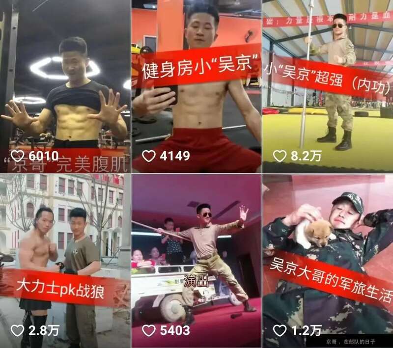 △从左往右:小吴京究极进化为了昊京 在此阶段,视频风格从过去的单一武打,变成了成分复杂 的爱国正义短剧。 在内容上,短剧处于一个想要脱钩京哥,但时机还未成熟的中间状态,通篇不会提一个京字,但处处都能看到咱京哥的影子。