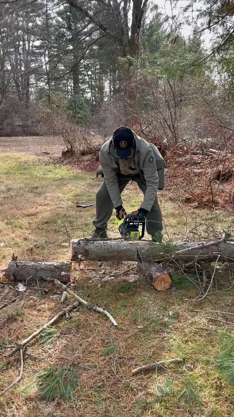 只见丁海峰身穿冲锋衣,头戴棒球帽,手里拿着电锯,正在娴熟地将砍倒的树木锯成一节一节长度相等的木头段。