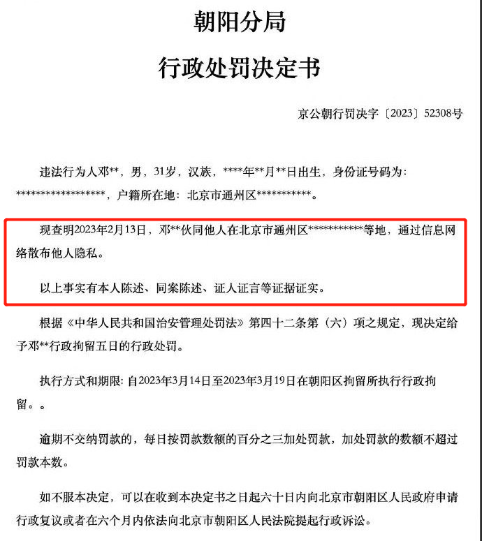 随后,网友在北京市公安局官网查询到相关信息,根据案情关键人物信息,一一对号。该案名称是“陈某某被侵犯隐私”,发布时间是2月13日,事由是邓某某伙同他人在互联网上散布他人隐私,证据包括当事人陈述及证人证言,执行时间是3月14日至3月19日。