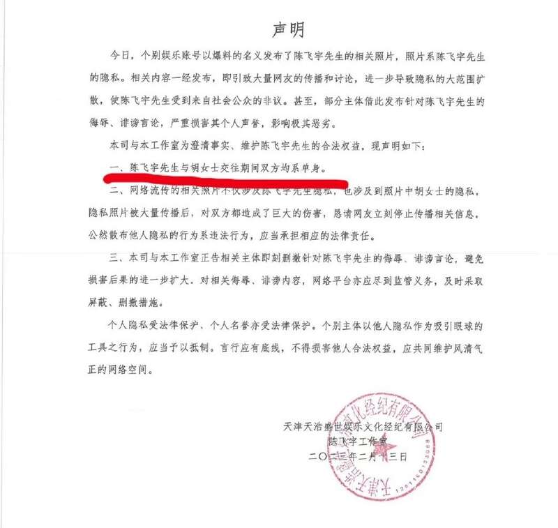 而后,陈飞宇经纪公司发布声明承认与女网红有过交往事实,并澄清表示两人交往期间均是单身身份,降低负面影响。同时,将对侵犯隐私的相关传播者进行维权,要其承担相应法律责任。