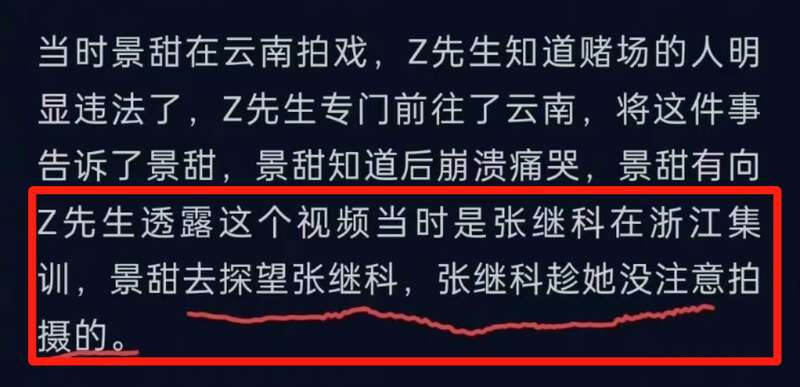 据狗仔称,“拿私密视频抵债”事件发生在2019年下半年,张继科与景甜已经分手,赌场的人找了一个能联系上景甜的中间人Z先生,告诉景甜手里有张继科给的私密视频向其索要2200万。当时景甜正在云南拍摄《司藤》,知晓后崩溃大哭,她还透露视频是自己探望张继科集训期间,张继科趁她没注意拍摄而成,换言之就是偷拍。