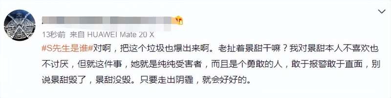 有了狗仔补充的细节,景甜的经历就更令人难过了,不仅被前任当冤大头一样还赌债,还被泄露私密视频。过去景甜谈到这段经历总是难以抑制情绪,害怕其他人知晓自己的窘境,误会她小题大做。如今始作俑者丑陋的行为被揭开,想必对她来说也是一种解脱,那些难以言说的未知的恐惧都不存在了。
