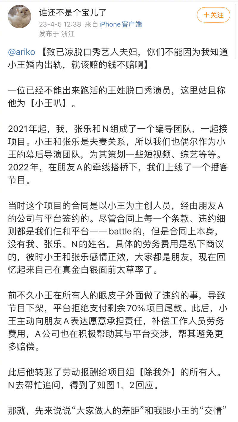 4月5日,娱乐圈再出大瓜,一位昵称是“谁还不是个宝儿了”的女网友发文爆料,称知名脱口秀演员王某婚内出轨,并且拖欠员工工资!
