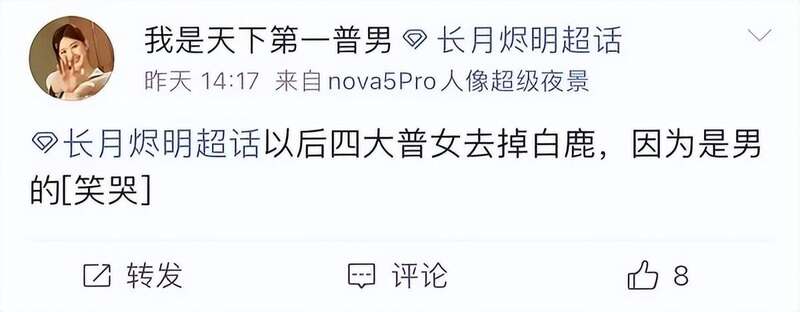 而她的另一则发言则是跟风最近网上的“娱乐圈普男普女”,称“白鹿不应该被评为普女,因为她是男的”。