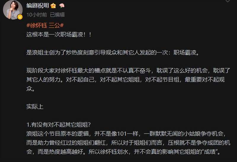 近日,徐怀钰参加《乘风2023》(浪姐4),但因为准备时间不足,导致在第一场公演表现欠佳,也遭到部分网友质疑态度不认真。不过,编剧祝明在14日发文,认为徐怀钰其实没对不起谁,会被骂成这样可能是受到节目组的利用:这根本是一次职场霸凌!