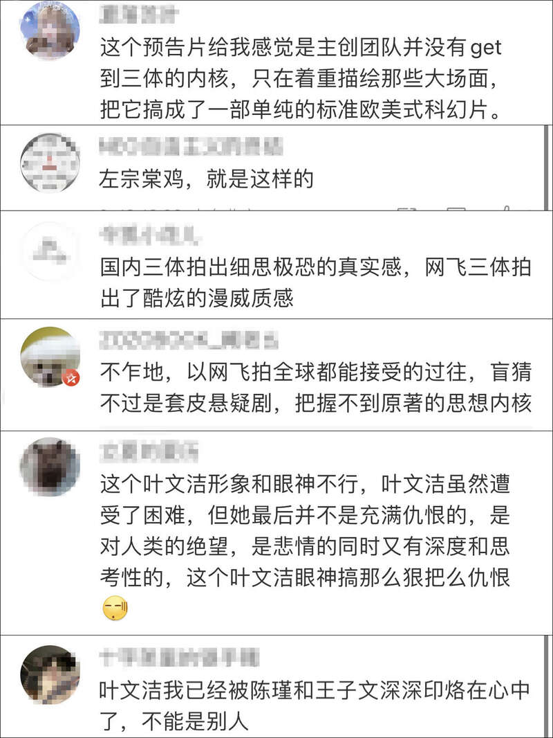 但不少网友直言,单从预告来看,主创团队似乎只浮于描绘大场面,没有拍出原著的内核,叶文洁的眼神仿佛只有仇恨,缺乏绝望和悲哀,演员对角色的把握不如陈瑾和王子文两位“天选叶文洁”。