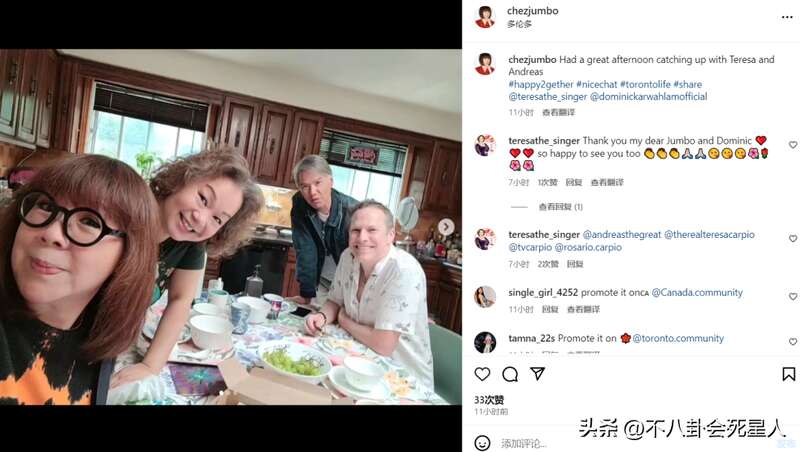 照片中四人笑着看向镜头,桌子上还摆着很多的水果,看样子几人正在吃水果喝下午茶。