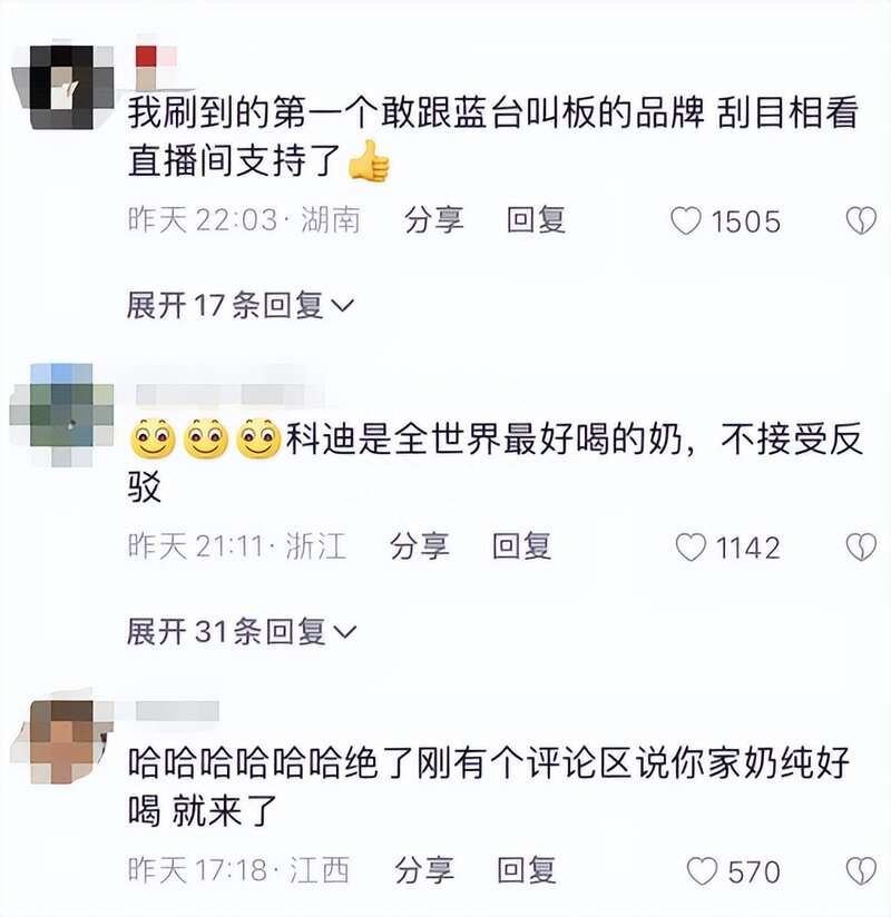 科迪牛奶公开发布视频抵制蓝台,称最近一直在关注李玟,并喊出口号“抵制蓝台从我做起”,获得了不少网友支持。