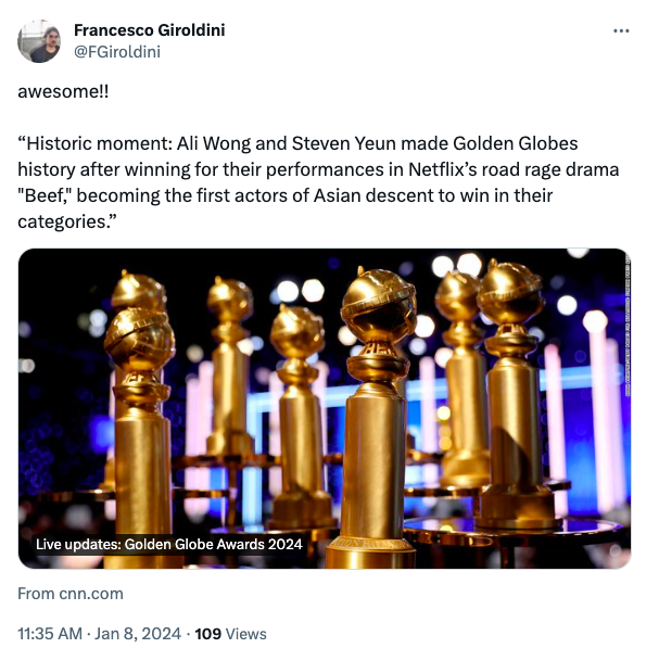 太棒了!!“历史性时刻:黄阿丽和史蒂文·元凭借在网飞剧《怒呛人生》的表演创造了金球奖的历史,成为了第一位在各自奖项中获奖的亚裔演员。”