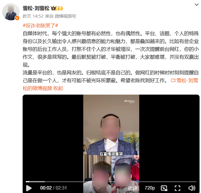 这还没完,时间来到今天,反诈老陈又带着「想起诉评论员话题」掀起一轮热度。就在老陈昨晚直播哭了之后嗷,网红评论员刘雪松下场发布视频点评了一波老陈。他在视频里有这么一句话: