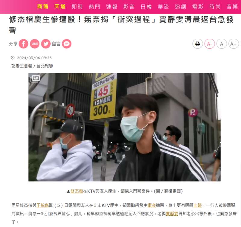 前两天,贾静雯的老公修杰楷和朋友在KTV庆生,因为劝架被打,还被带到了警察局。