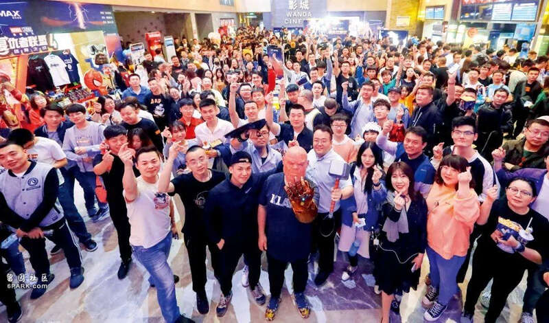 2019年4月23日晚,山西太原市一家电影院内,大批影迷和《复仇者联盟4:终局之战》中的“灭霸”形象合影。图/中新