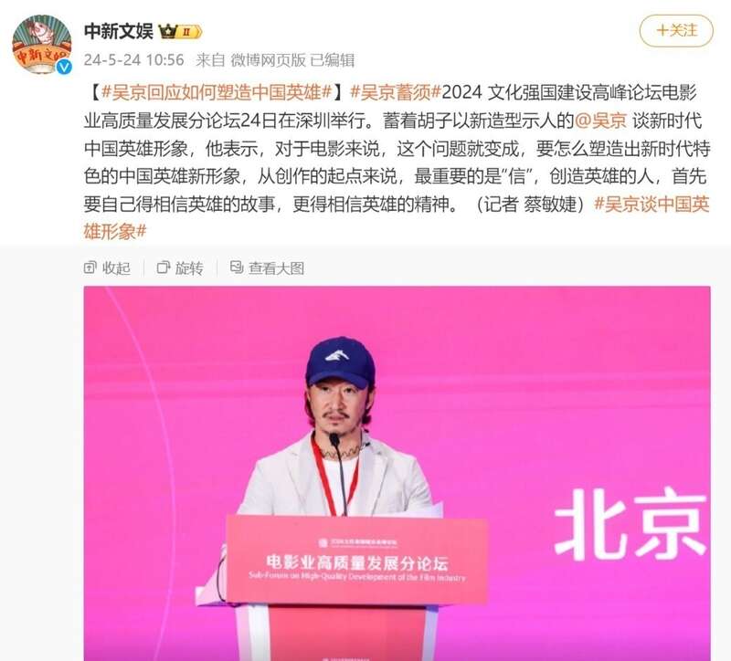 5月24日,2024文化强国建设高峰论坛电影业高质量发展分论坛24日在深圳举行。蓄着胡子以新造型示人的吳京谈新时代中国英雄形象,他表示,对于电影来说,这个问题就变成,要怎么塑造出新时代特色的中国英雄新形象,从创作的起点来说,最重要的是“信”,创造英雄的人,首先要自己得相信英雄的故事,更得相信英雄的精神。(记者 蔡敏婕)