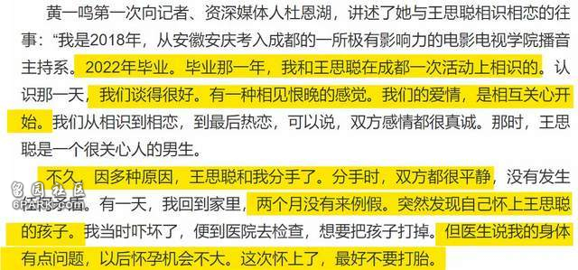 黄一鸣称自己是在2022年毕业之后,因为一个偶然的机会认识王思聪的,然后两人就在一起了,但不久因为多种原因两人和平分手。两个月后她去检查发现自己怀孕了。