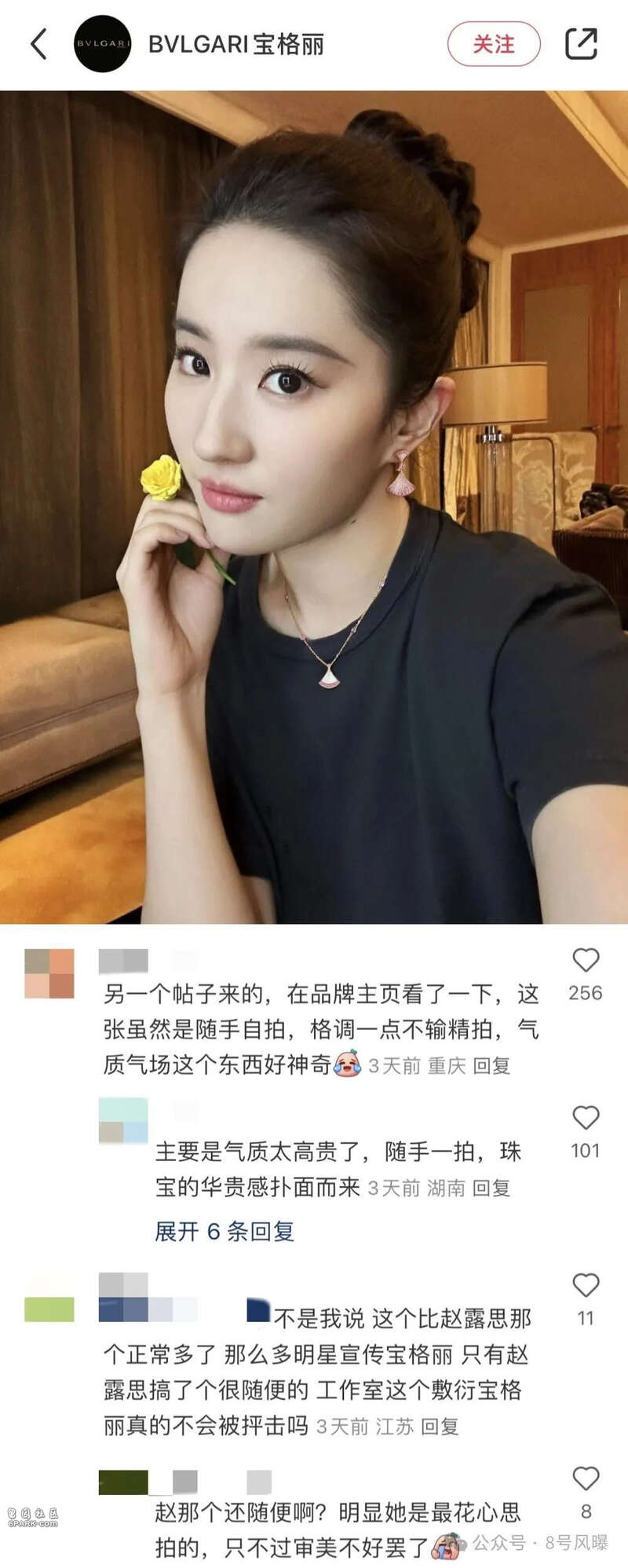 宝格丽官方账号发出一条刘亦菲的随手拍,评论区几乎满是好评:这张虽然是随手自拍,格调一点不输精拍,气质气场这个东西好神奇。