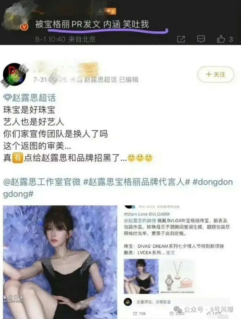 后续有传闻称,赵露思工作室返图的审美疑似被宝格丽品牌公关发文吐槽,认为这张返图的审美真有点给赵露思和品牌招黑了。