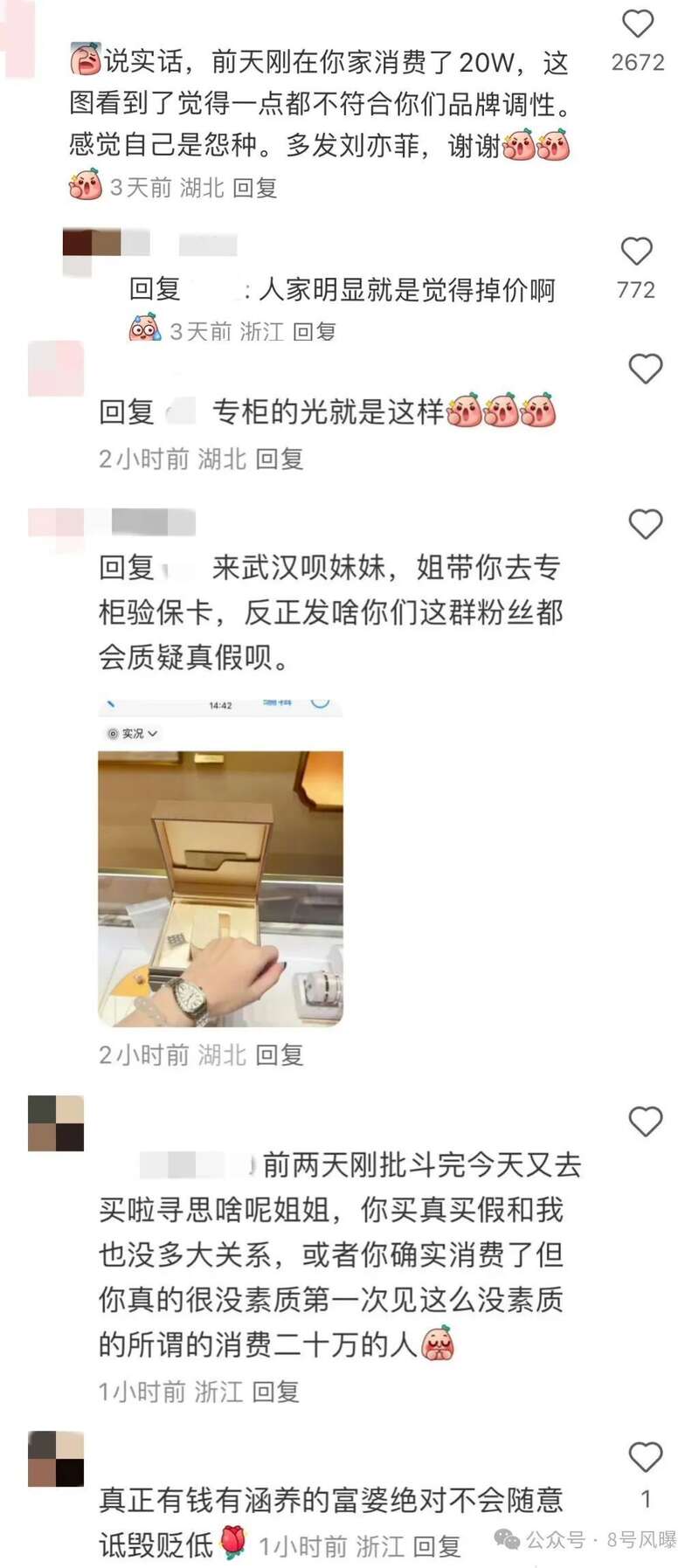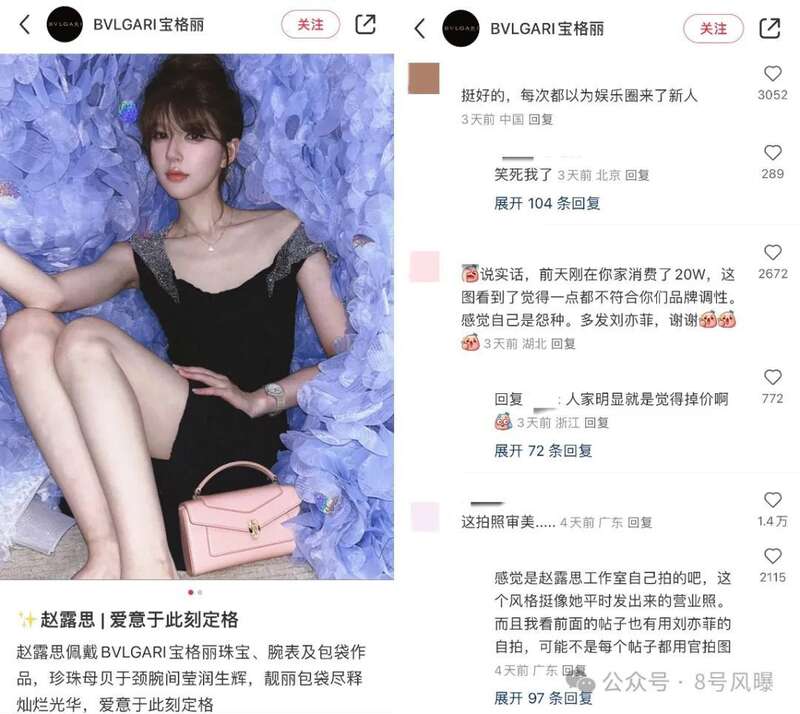 宝格丽这条官方帖子下有消费者声称自己在宝格丽消费20万,但认为代言人赵露思和品牌的调性不符,感觉自己是怨种。