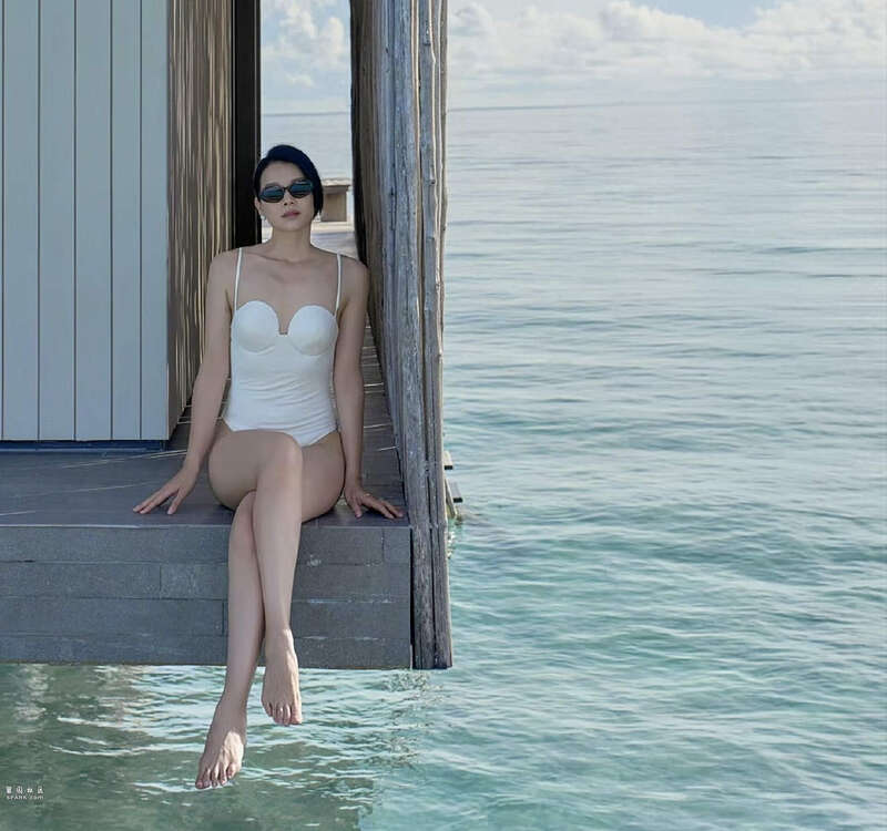 穿着白色的泳装,胡杏儿戴着墨镜,把部分头发扎起。穿着黑色的泳装,胡杏儿又选择把头发全都披下来。