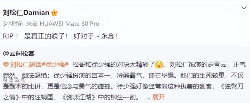 对于徐少强去世,雪梨发文悼念:“祝徐少强先生一路走好。”