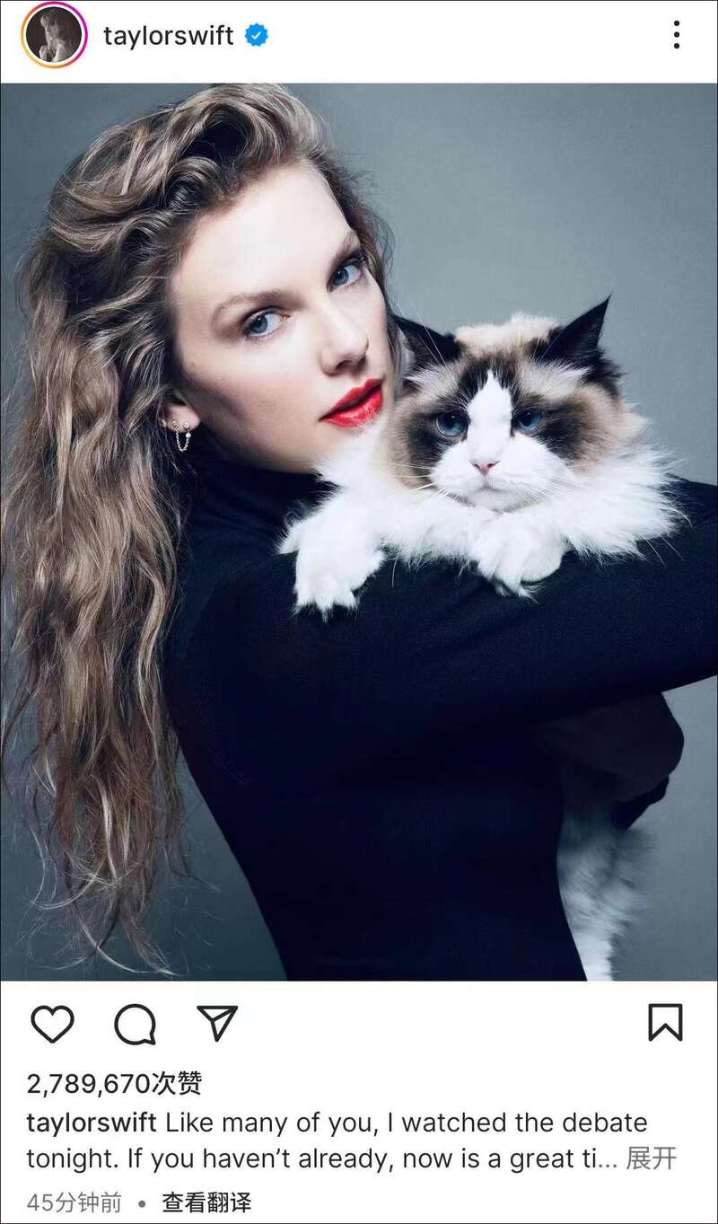 泰勒·斯威夫特当地时间9月10日发帖,宣布支持哈里斯Instagram截图