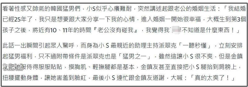 更微妙的是小S每一次提及夫妻互动一事时候的语序,主语都是她老公,很明显是男方不想,而不是女方不想。