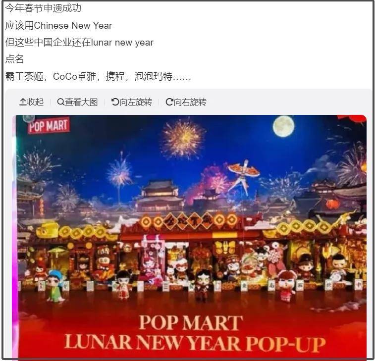 这里先点名霸王茶姬、泡泡玛特等中国品牌,竟然还在使用错误说法“lunar new year”,建议尽快道歉改正,春节是农历年,农历是阴阳合历,“lunar new year”有所偏颇,“Chinese new year”才是正确表达。